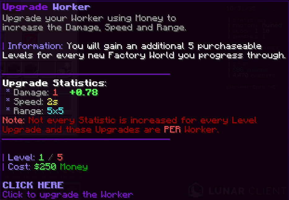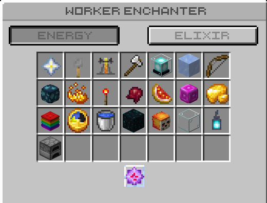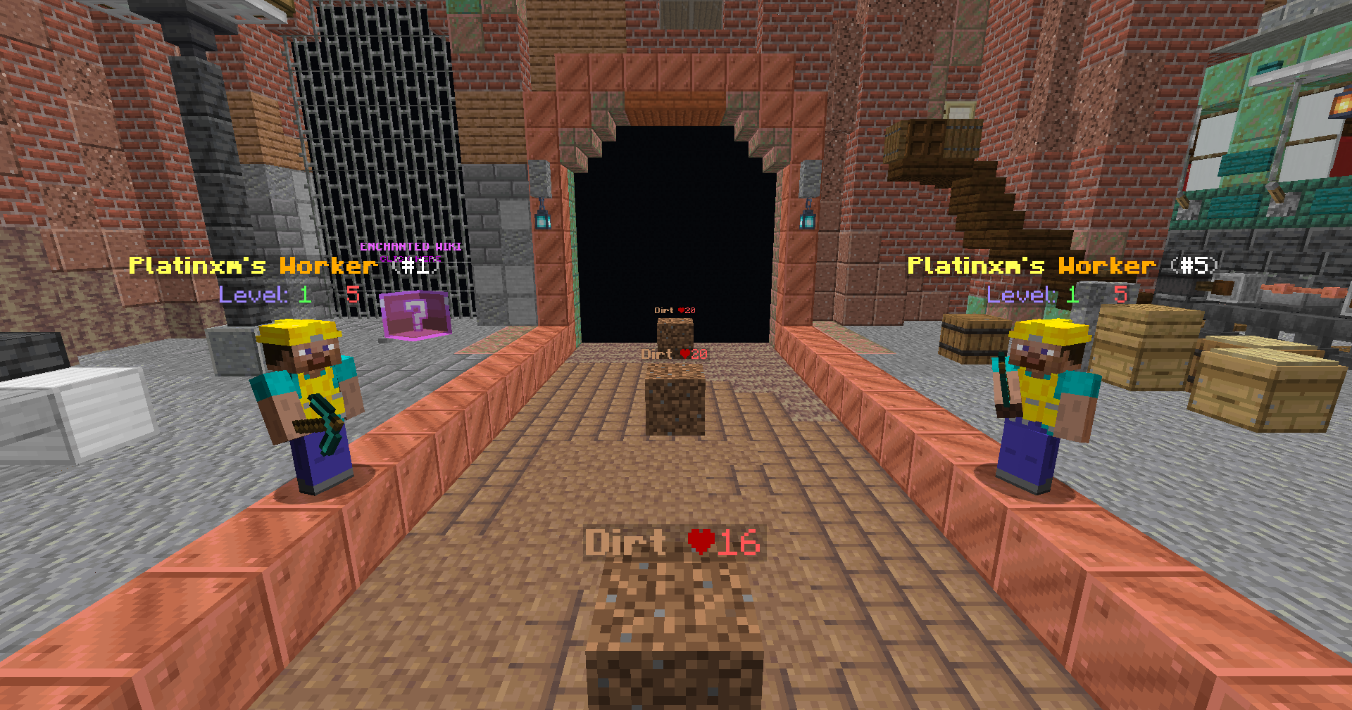You'll notice that you spawn in with a nether star, which is used to enchant your workers. Enchants go across all workers, meaning upgrading 1 enchant will affect all workers. New enchants can be unlocked by reaching certain swing level milestones. You gain experience from your workers attacking the blocks at your factory. You can see this level just above your hotbar or by hovering over your worker enchants menu.
