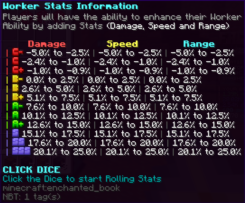 Worker stats are similar to traits, but work differently in the boosts they provide. You'll need to obtain either normal or special stat dice to roll for a stat. When you roll, you are given grading for damage, attack speed, and range. Normal stat dice rolls all 3, whereas special stat dice roll only 1 of them, allowing you to keep a good roll.