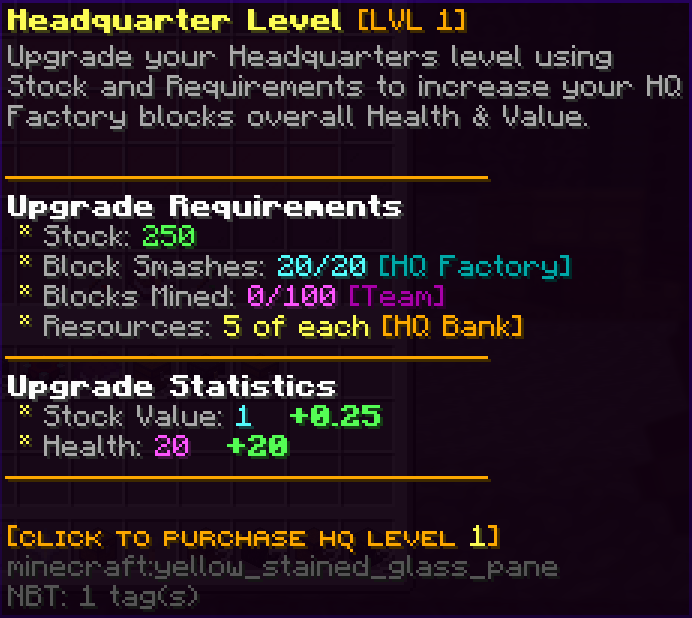 Headquarters have another factory, separate from your own and your teammates factories. You can teleport there by clicking on the eye of ender in your HQ menu. The blocks broken at the HQ factory by workers give you stock, which is used to buy HQ upgrades and increase your HQ level!