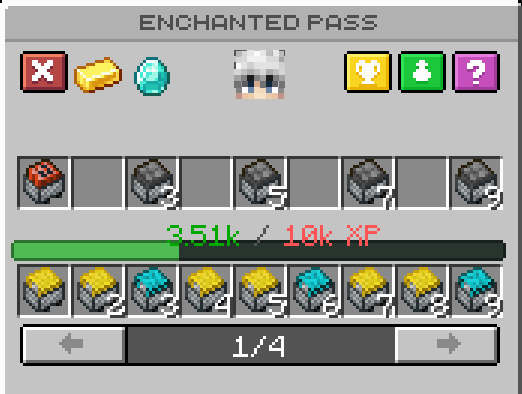 The Enchanted Pass is a reward system that gives you exclusive rewards as you level up. You can pass experience through worker swings and mining blocks in the mine. You can gain access to even more rewards by upgrading to the gold or diamond pass!