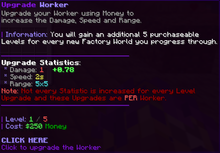 Additionally, progressing to each Factory will grant you with an increased Enchant level cap of 100+ for every Enchant, and 5+ Upgrades for Workers (which consist of Damage, Speed and Range buffs)