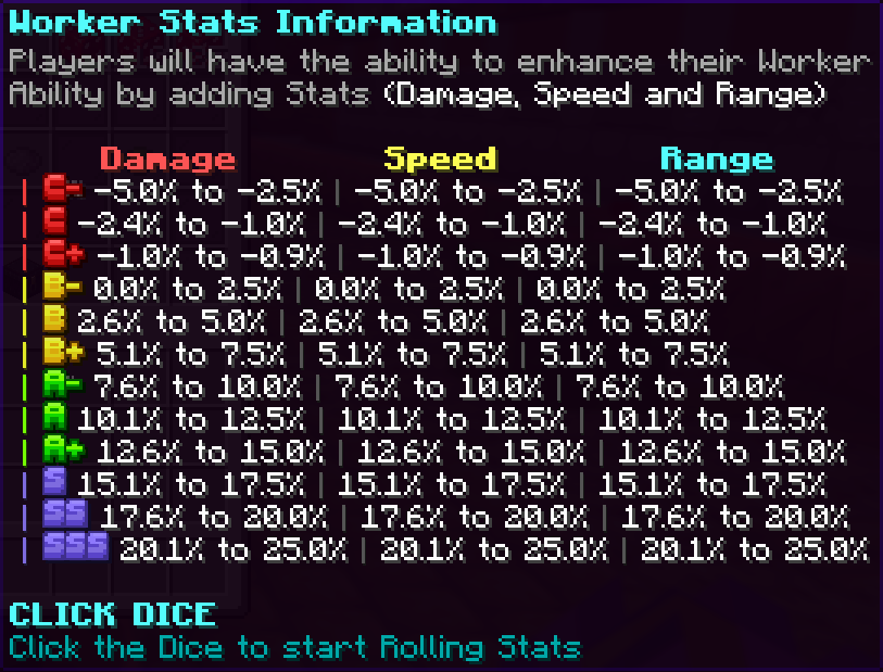 This is a similar system to Pet Stats, but for Workers, there are a total of 3 Buffs that can be rolled onto individual Workers. These consist of the main buffs of Damage, Speed and Range. Prices are the same as Traits for both Normal/Special.